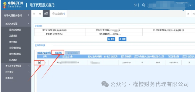 4. 查看“是否存在委托关系”,如显示“否”则表示双方还未签订代理报关委托关系,打勾,然后点击“发起委托”。